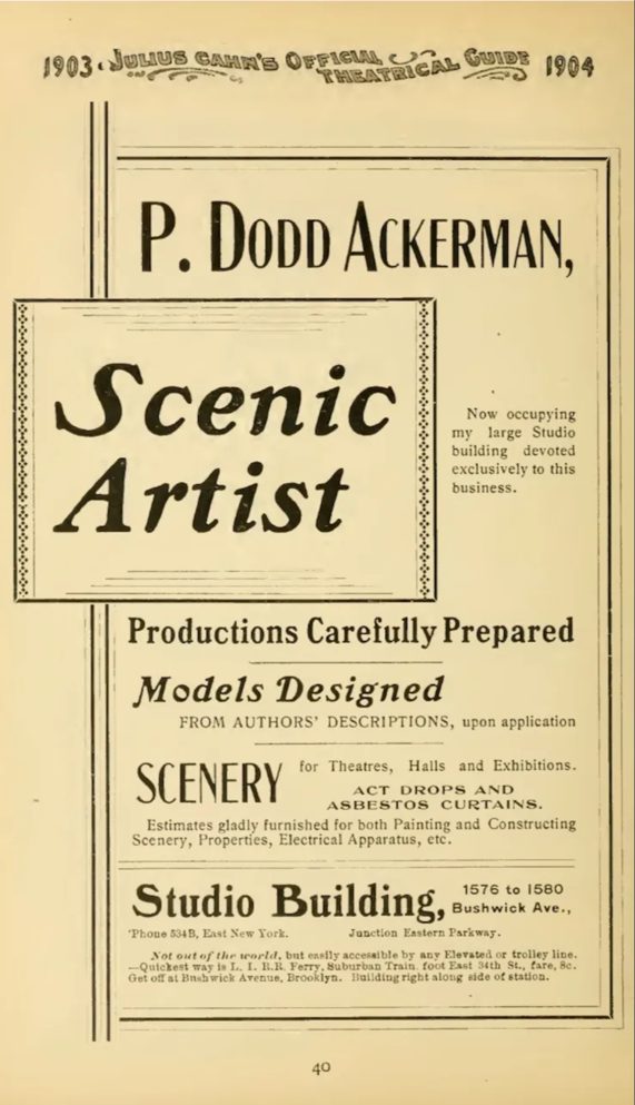 One of Ackerman’s early productions was staged at the Tampa Bay Casino in February 1918. The Tampa Times noted “P. Dodd Ackerman the famous scenic artist, who paints the marvelous scenes for the New York Hippodrome and the Winter Garden, has surpassed his former efforts in the scenic investiture for Very Good Eddie.”