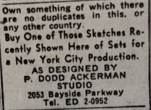 He and Mrs. Ackerman were founding members of the Fort Myers Little Theater. The Fort Myers News Press carried ads for his studio. “Own something of which there are no duplicates in this, or any other country. Buy One of Those Sketches Recently Shown Here of Sets for a New York City Production. As Designed By P. Dodd Ackerman Studio, 2053 Bayside Parkway. Tel. ED 2-0952. In 1961 a fallout with friends in Fort Myers prompted Ackerman to move back to New York. He died there, age 87, in 1963.