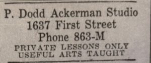 Some time in the early 1920’s Ackerman acquired a block of waterfront property facing the Caloosahatchee River, on McGregor Boulevard, just outside the city limits of Fort Myers. His home, River House was completed for Christmas of the 1939-40 winter season. After the war Ackerman place frequent ads in the Fort Myers New Press reading, P. Dodd Ackerman Studio, 1637 Frist Street, Phone 863-M. Private lessons only, Useful arts Taught.