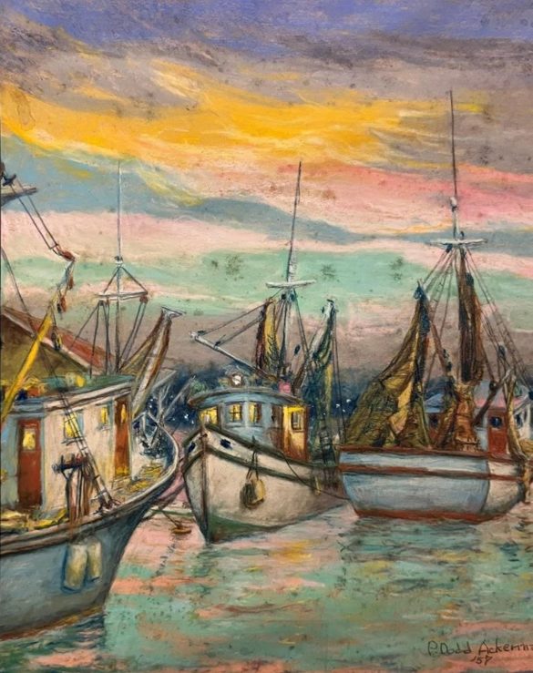 P. Dodd Ackerman, Shrimp Boats, Fort Myers, mixed media 20 by 16 inches. Sighed lower right P. Dodd Ackerman, 57.