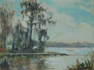 The murals at both the Orlando Chamber of Commerce and Memorial Junior Hight appear to have been lost when the buildings were demolished. The Orlando Sentinel (March 21, 1937) notes the Memorial murals (center panel 10 feet wide by 13 feet high, with two side panels both 7 feet wide tapering from 13 to 7 1/2 feet) were not painted directly on concrete or dry wall, they were “hung,” and should have survived demolition. Did they? As for the Davenport murals at the Chamber of Commerce, they were 10 by 12-foot panels. What happened to them? Berner died in Orlando, June 25, 1953. Born: 1879, Grand Rapids, Michigan. Died. June 25, 1953, Orlando. Education: Art Institute of Chicago; with Weyman Adams and John Vanderpool; Rollins College with George Ganiere. Membership; Florida Federation of Art; Orlando Art Association. Exhibits: South Florida Fair, Tampa Fair Grounds, February 1921, first prize, watercolor from nature, third prize, oil portrait from nature, first prize, charcoal; Students’ Art Club, 2nd Annual Exhibit of Florida Art, Tampa Museum of Art, City Hall, March 12- 19, 1923, Oaks at Palm Springs; Tampa Art Institute, 5th Annual Exhibit of Florida Artists at Tampa City Hall, March 1926, Marches of the St. Johns, Portrait of a Lady, Flatwoods November, Hibiscus, Banks o’ Gatlm; South Florida Fair, Tampa, February 1927, award portrait copy; Orlando Art Association, Florida artist exhibit, May 1927, 1st prize flower study, Peonies; Central Florida Exposition, Orlando, February 1928, 1st prize, oil portrait, 1st place, still life, 2nd prize, original composition; Tuttle Shop, 16 North Orange Avenue, October 1928, Zinnias and a portrait, Mrs. E. G. Duckworth; Orlando Art Association at Chamber of Commerce, November 1928, Zinnias; Central Florida Exposition, Orlando, February 1930, 1st prize in landscape, prize, portrait in oil; Orlando Art Association, at Chamber of Commerce, December 1931; Orlando Chamber of Commerce, December 1931, two-man exhibit with Florence Hudson, 34  paintings, many of Florida scenes; Art Mart in Murphy Arcade, Orlando, January 20, 1934; Orlando Art Association at Chamber of Commerce, January 1935, Little Wekiwa and Cypress Water;  Florida Art Project of Florida Emergency Relief administration, at Florida State College for Women, June 1935; Federal Art Project, Florida State Fair, Tampa, June 1937; Florida Federation of Art 14th Annual Circuit, December 5, 1941, Tampa, best Florida subject, Morning on the Little Wekiwa.