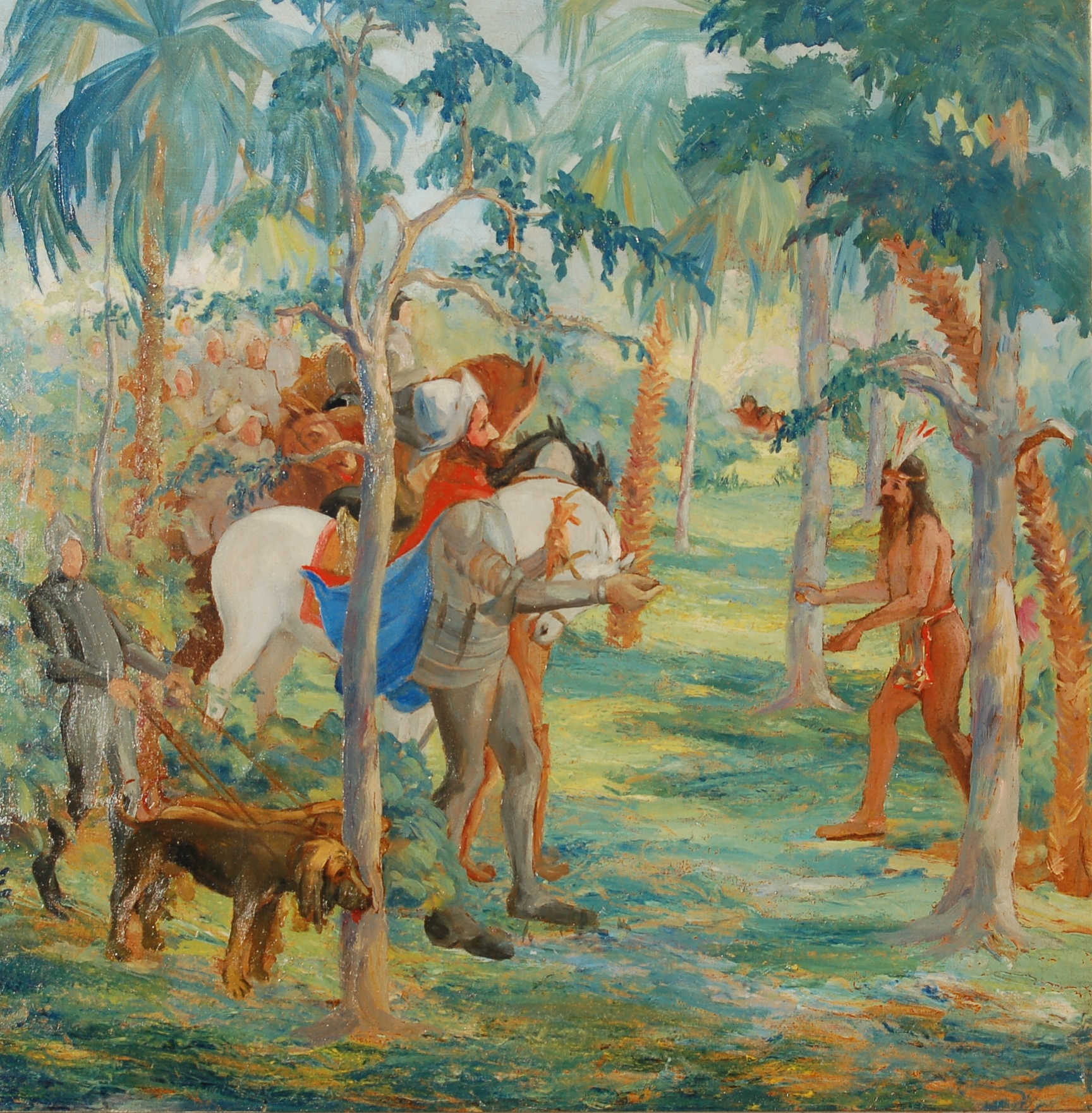Emmaline Buchholz, DeSoto Coming to Tampa Bay, oil on canvas, 30 by 30 inches. Sighed on verso. Buchholz’s entry for Florida Exhibit, Chicago Century of Progress, exhibited at Ringling Museum, 1932.