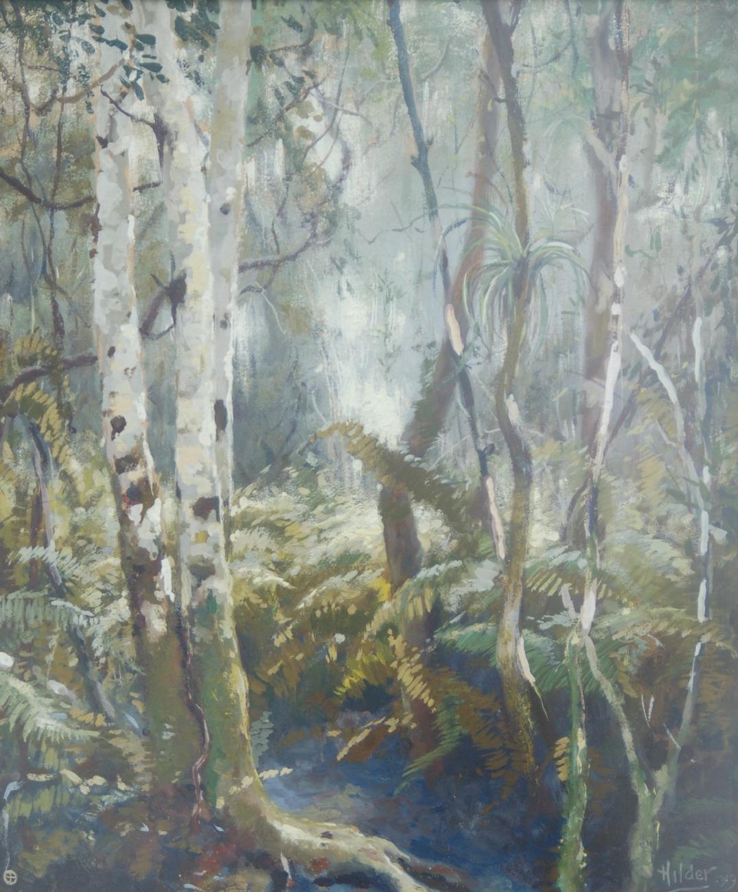 He has expressed the spirit of Florida in a manner unrivaled. Mr. Hilder’s recent exhibition at the home of Mrs. David Todd in Coconut Grove, was an overwhelming success more than two-thirds of the pictures having been sold. Mr. Hilder returns shortly to Charleston, S.C., where in 1917, the Charleston News-Courier said of his work, ‘It will be remembered that Mr. Hilder is a poet as well as an artist, several of his poems appeared last winter in the columns of the News- Courier and Charleston is to be congratulated in having found favor in his eyes and we, his friends, in the fact that he will soon again be with us.’ Mr. Hilder’s service to Florida, not only in expressing so truly and skilfully the rather difficult beauties of her tropic jungles, but in bringing these same beauties before the people of the United States as widely as the crowds at his northern exhibitions would indicate, is unquestioned.”