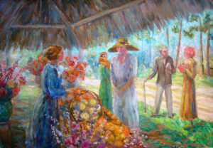 I next met Lillian on eBay. Four of her canvases were listed. I couldn’t believe my eyes. Wow! Few people know about her work, but my paranoia made the wait for the auction to end a nervous time. But the paintings were soon mine. One was a double picture, on side with a 1920’s pickup truck outside The Mecca, presumably an old theater in DeLand, another sun-drenched impressionistic scene. On the opposite side is what I like to think of as, A Sunday Morning After Church. There is Lillian, in a pretty Sunday dress, and flowing hat, under a palm thatched hut, about to purchase frit or flowers. Nearby in Sunday best are a gentleman and his wife in quiet conversation. Lovely.