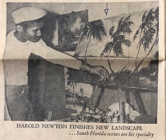 Newton’s first public recognition as an artist came when the Indian River Press- Journal, January 28, 1954, published a photograph of him, along with Bob Curzon, Press-Journal Sports Editor, holding one of Newton’s canvases. The caption reads, “Harold Newton 19-year-old Spruce Park Negro, proudly displays a tropical oil painting he recently finished. Newton, who has had no formal art training, has an uncanny knock of capturing the beauty of Florida on canvas. Many local people who have seen the young Negro’s work are hoping that some arrangement can be made to sponsor his art schooling.” By the summer of 1955 the Indian River County Court house was boasting, “Harold Newton, talented Negro artist, has brought culture and appreciation of the arts to the courthouse. Several of the County offices now boast oils by Newton.”