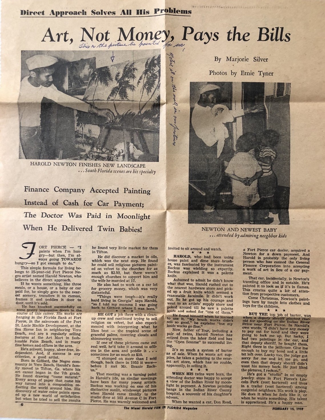 Fort Pierce— “I paints when I’m hungry—but then, I’m always going “Towards hungry—so I got enough to do. “This simple formula for living belongs to 25-year-old Fort Pierce Negro artist named Harlod Newton, who believes in the direct approach. If he wants something, like three meals, or a house, or a baby or car paid for, he simply to the nearest scenery, transfers it to canvas, frames it, and peddles it door to door until it’s sold.