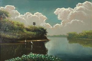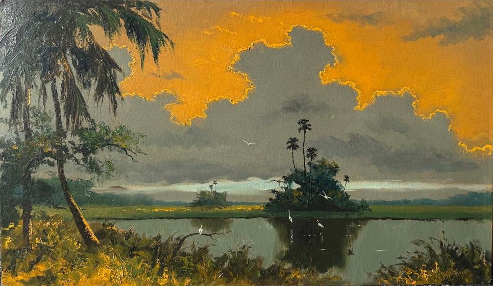 Harold Newton was the first of a group of African American artists known as the Highwaymen. In 1953 Newton approached Ft. Pierce artist Beanie Backus for advice. They met, and Backus convinced him to give up religious painting and concentrate on landscapes. Newton never studied with Backus. He is classified with the Highwaymen but as an independent black artist in temperament and demeanor, he was never really with them. Like the Highwaymen, his technique resembled Backus. Newton using inexpensive materials, sold his work door to door for $25, and produced thousands of paintings. Although prolific, Newton’s paintings are some of the finest of Highwaymen art.